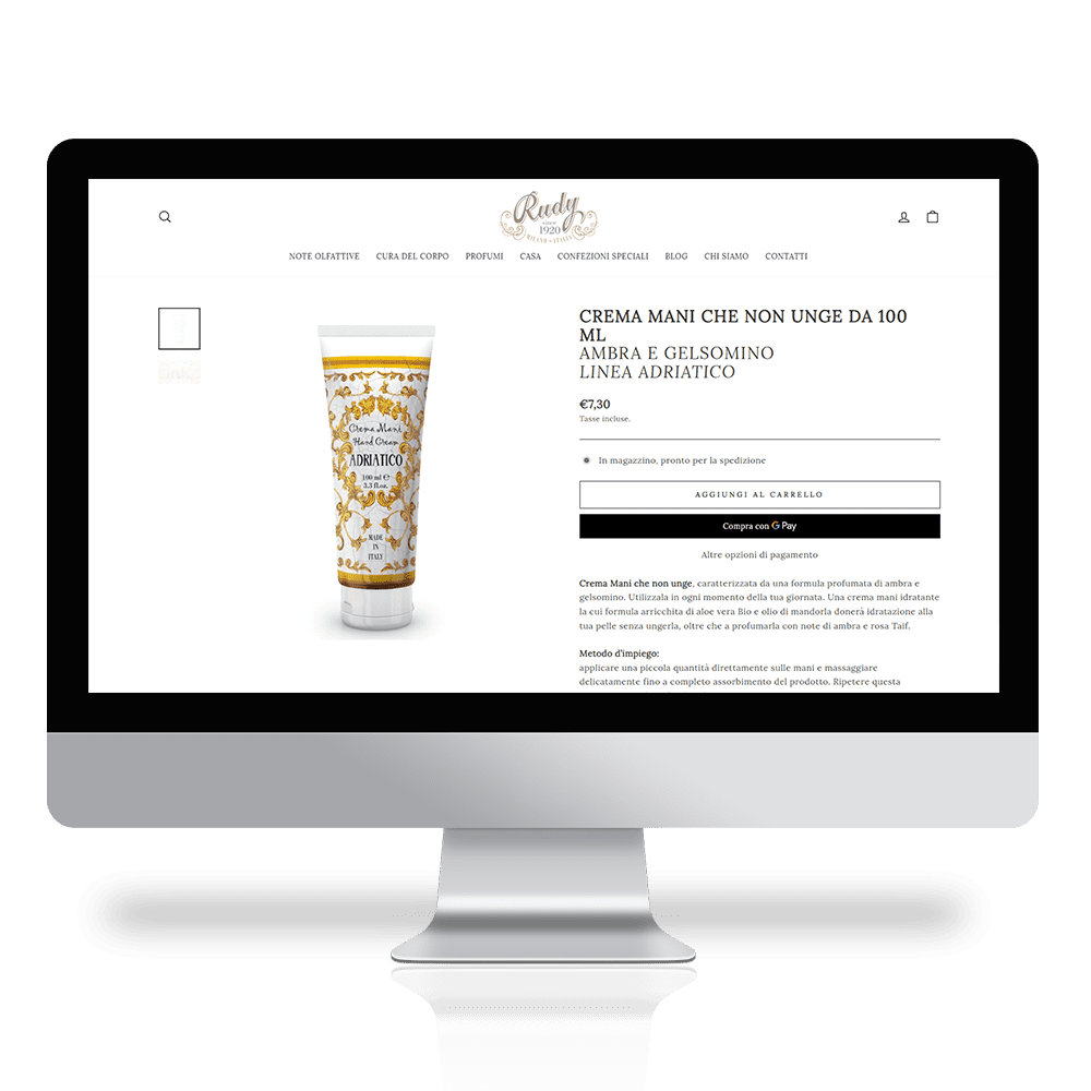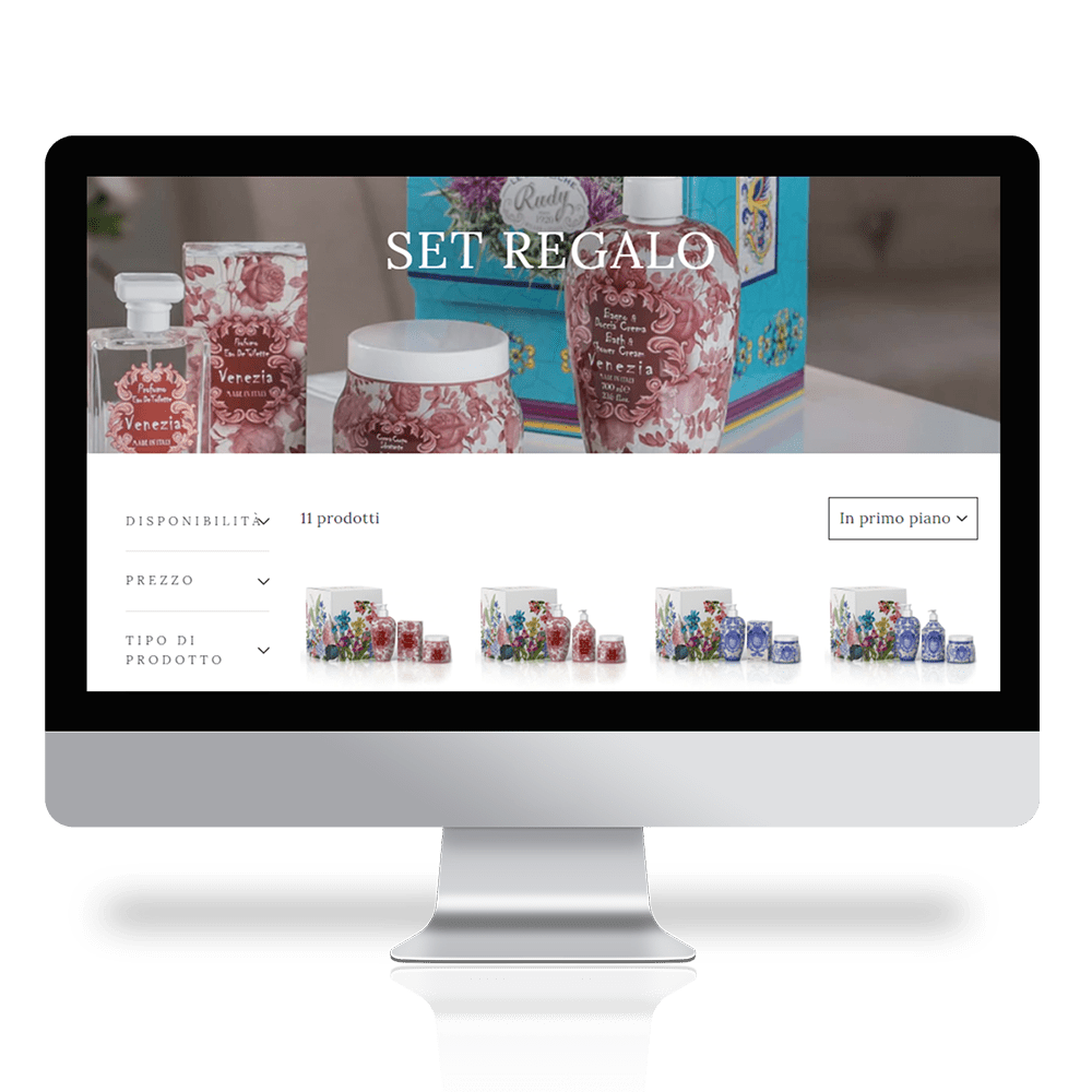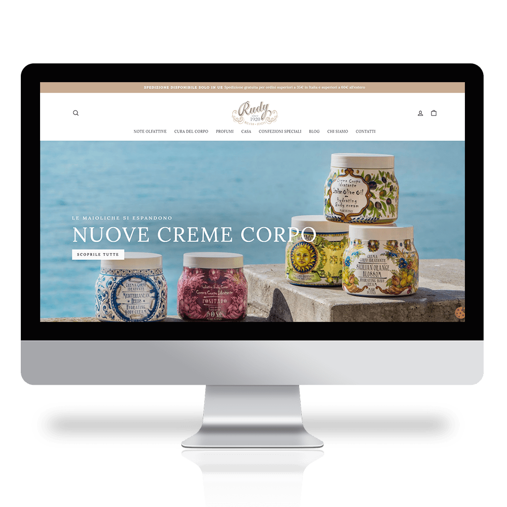 Rudy profumi storico brand italiano attivo sul mercato dal 1920 si è affidato a noi per il completo restyling del suo sito e-commerce. Unica sua fonte di business attualmente in opera. La situazione iniziale prevedeva 2 distinti siti, uno istituzionale e uno dedicato all’ecommerce. Il nostro obiettivo è stato quello di unire i due siti, ottimizzare il numero di visite, migliorare la sua brand awareness, rendere il brand forte nell‘indicizzazione sui motori di ricerca e aumentare le vendite.